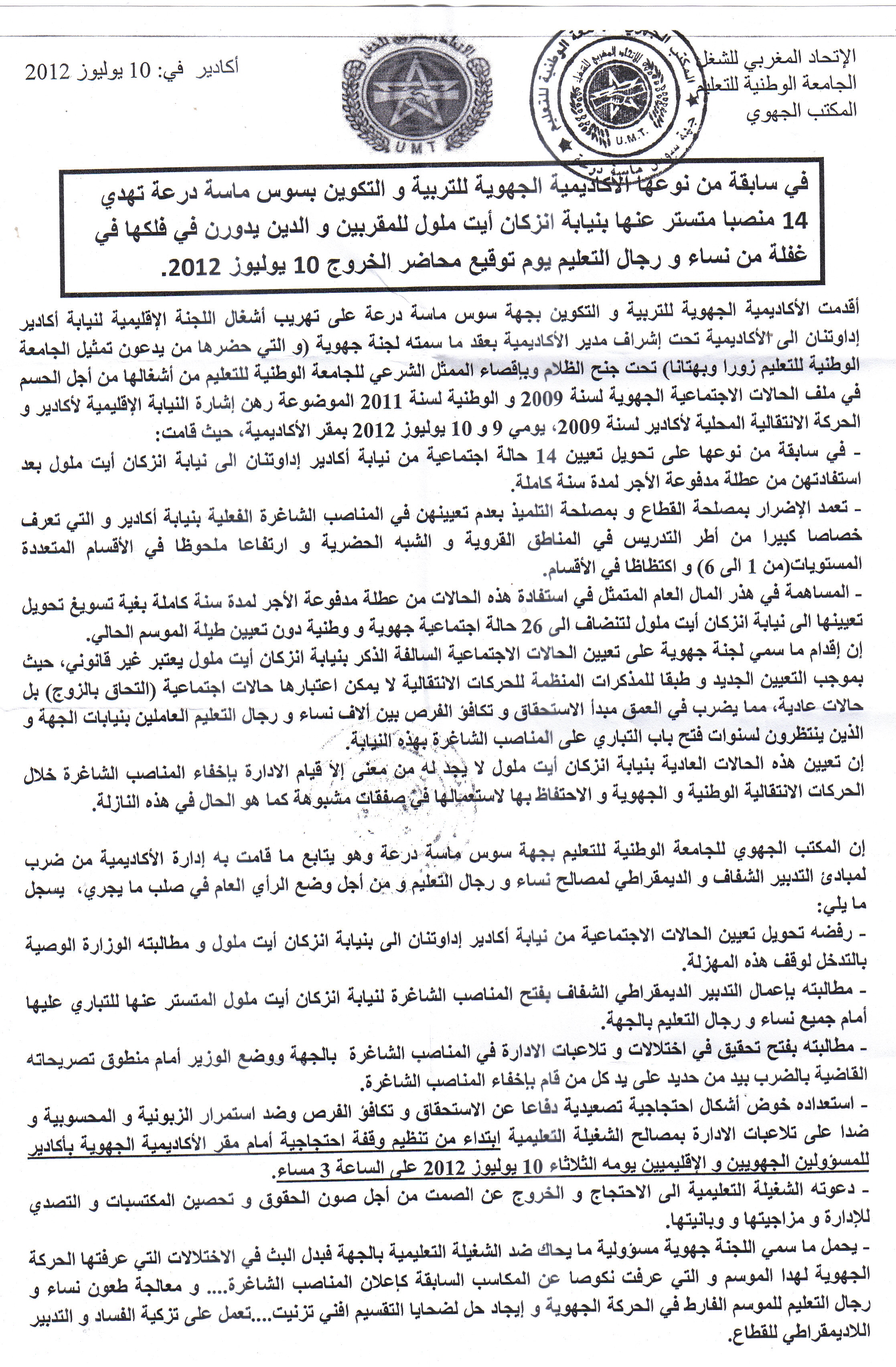 – استعداده خوض أشكال احتجاجية تصعيدية دفاعا عن الاستحقاق و تكافؤ الفرص وضد استمرار الزبونية و المحسوبية و ضدا على تلاعبات الادارة بمصالح الشغيلة التعليمية ابتداء من تنظيم وقفة احتجاجية أمام مقر الأكاديمية الجهوية بأكادير للمسؤولين الجهويين و الإقليميين يومه الثلاثاء 10 يوليوز 2012 على الساعة 3 مساء.