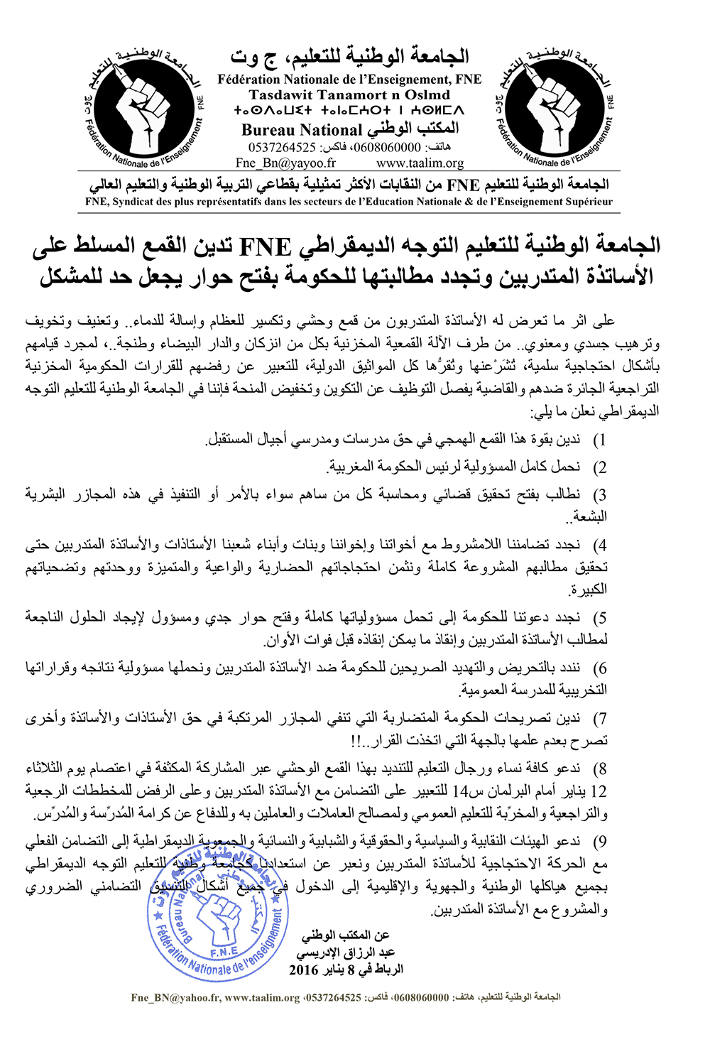 - ندعو كافة نساء ورجال التعليم للتنديد بهذا القمع الوحشي عبر المشاركة المكثفة في اعتصام يوم الثلاثاء 12 يناير أمام البرلمان س14 للتعبير على التضامن مع الأساتذة المتدربين وعلى الرفض للمخططات الرجعية والتراجعية والمخرِّبة للتعليم العمومي ولمصالح العاملات والعاملين به وللدفاع عن كرامة المُدرِّسة والمُدرِّس.
