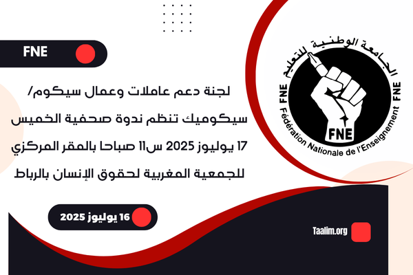 لجنة دعم عاملات وعمال سيكوم/سيكوميك تنظم ندوة صحفية الخميس 17 يوليوز 2025 س11 صباحا بالمقر المركزي للجمعية المغربية لحقوق الإنسان بالرباط
