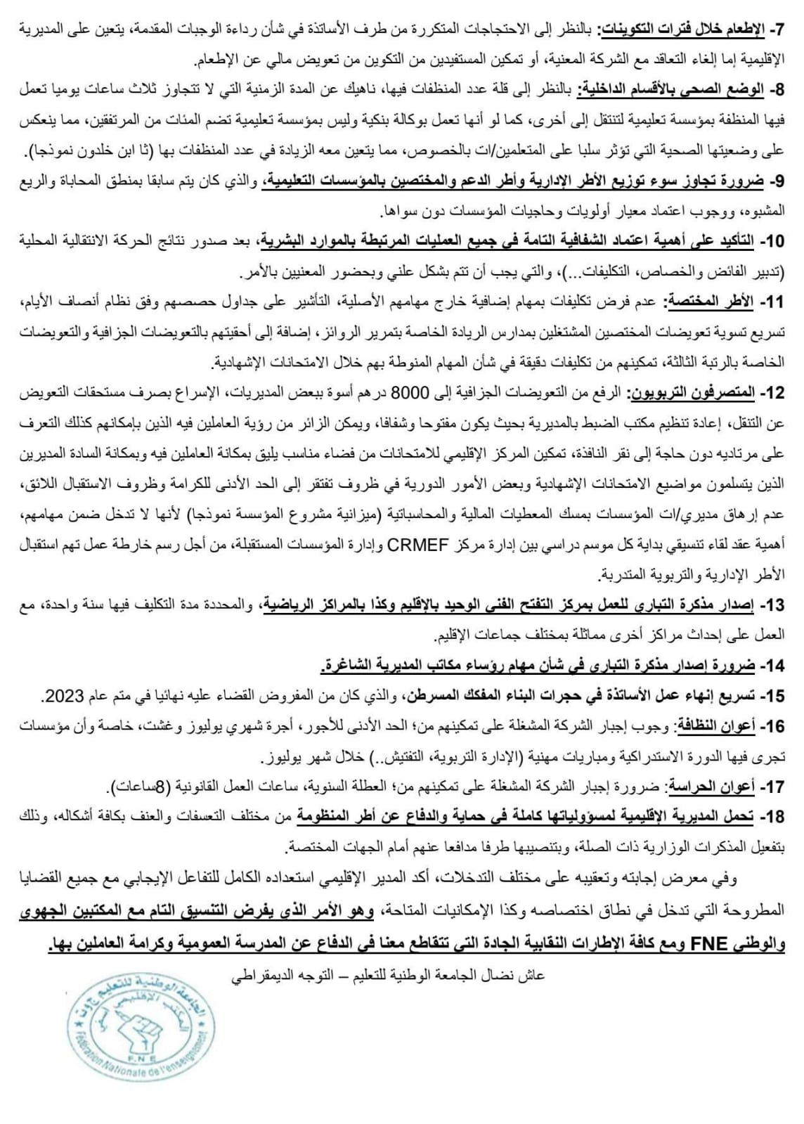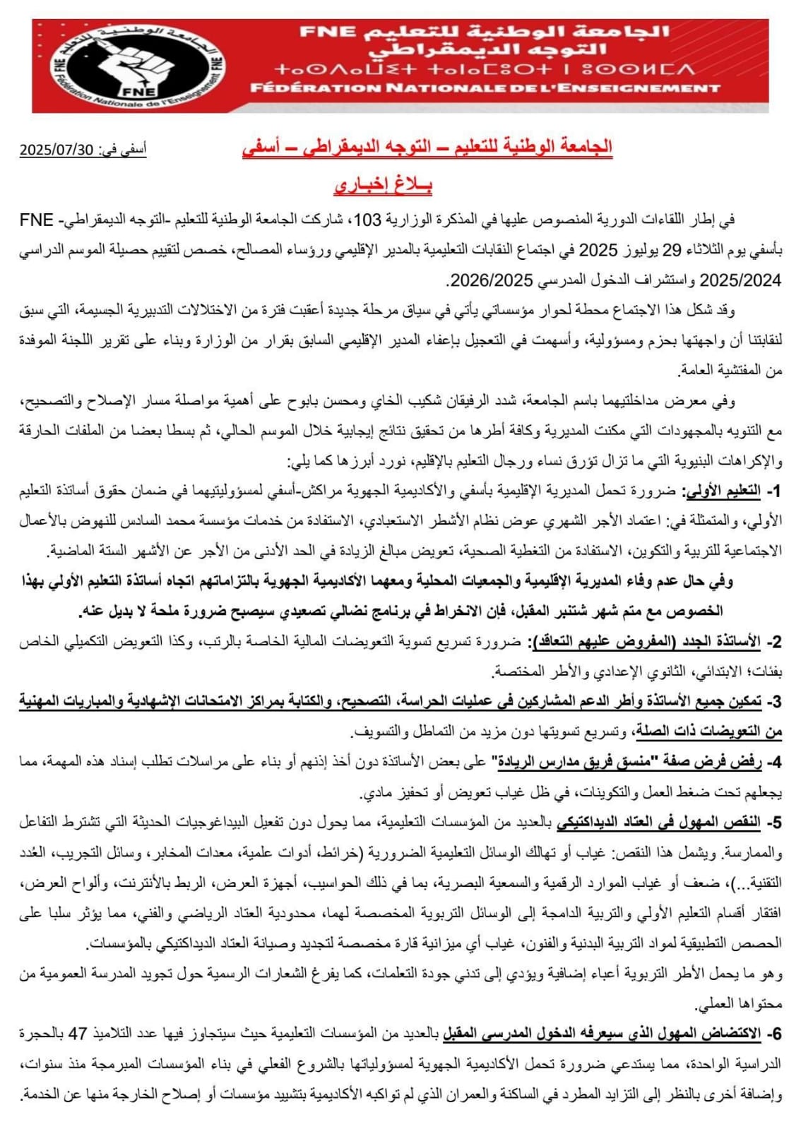 اسفي: بلاغ المكتب الإقليمي للجامعة الوطنية للتعليم FNE حول لقاء النقابات التعليمية مع مصالح المديرية الإقليمية