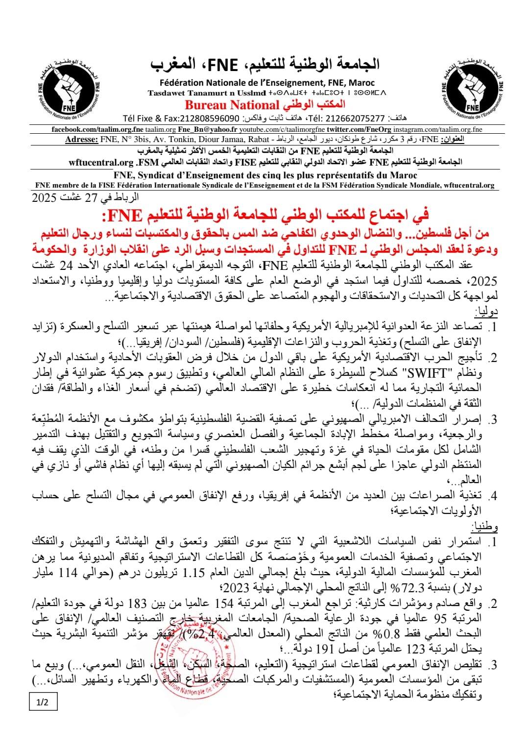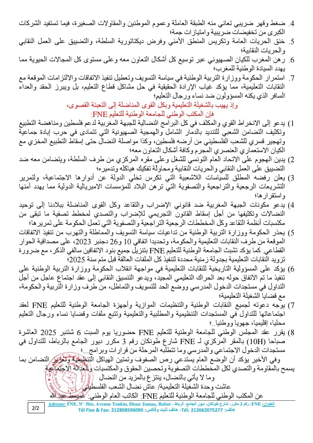 8) يقرر عقد المجلس الوطني للجامعة الوطنية للتعليم FNE حضوريا يوم السبت 6 شتنبر 2025 العاشرة صباحا (10H) بالمقر المركزي لـ FNE شارع طونكان رقم 3 مكرر ديور الجامع بالرباط، للتداول في مستجدات الدخول الاجتماعي والمدرسي وما تتطلبه المرحلة من قرارات وبرامج…؛