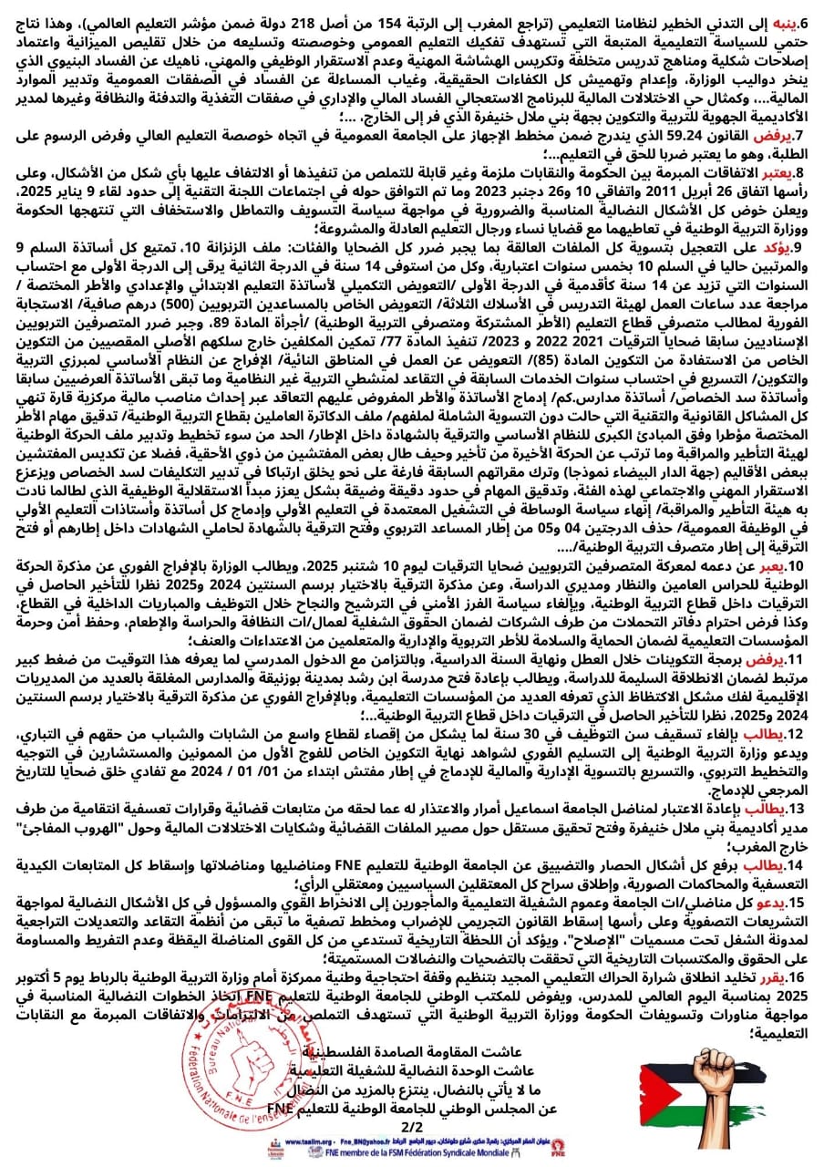 وإذ يشيد المجلس الوطني بالأداء القوي للجامعة الوطنية للتعليم FNE ووفائها لخطها الكفاحي وتوجهها الوحدوي، وانحيازها التام لقضايا الشعب المغربي وقضايا نساء ورجال التعليم وعموم الشغيلة، وكذا تثمين الدينامية التنظيمية التي تعرفها بما يعزز صفوفها ويؤهلها لمواجهة كل التحديات، فإنه: