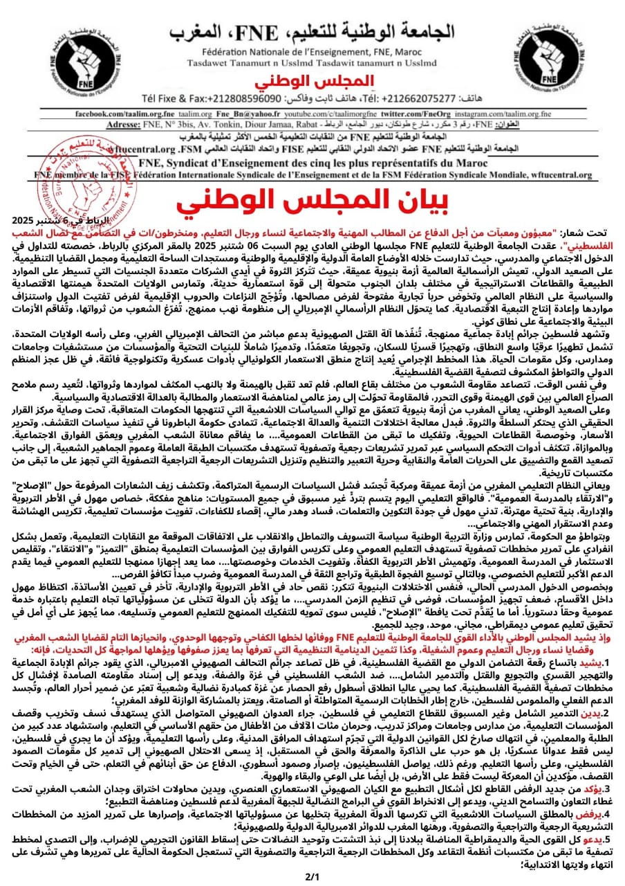 بيان المجلس الوطني FNE المنعقد بتاريخ 6 شتنبر 2025