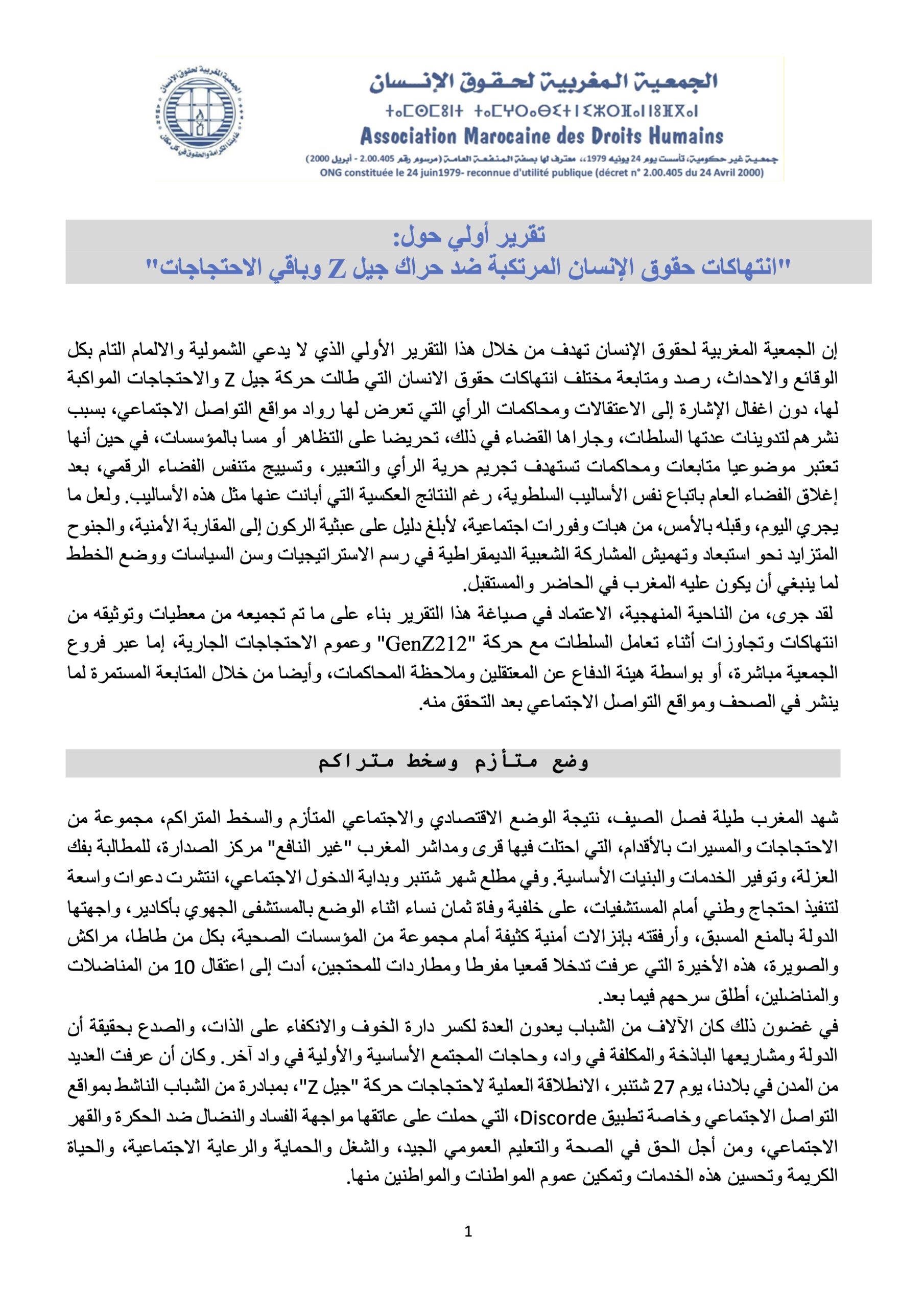 إن الجمعية المغربية لحقوق الإنسان تهدف من خلال هذا التقرير الأولي الذي لا يدعي الشمولية والالمام التام بكل الوقائع والاحداث، رصد ومتابعة مختلف انتهاكات حقوق الانسان التي طالت حركة جيل Z والاحتجاجات المواكبة لها، دون اغفال الإشارة إلى الاعتقالات ومحاكمات الرأي التي تعرض لها رواد مواقع التواصل الاجتماعي، بسبب نشرهم لتدوينات عدتها السلطات، وجاراها القضاء في ذلك، تحريضا على التظاهر أو مسا بالمؤسسات، في حين أنها تعتبر موضوعيا متابعات ومحاكمات تستهدف تجريم حرية الرأي والتعبير، وتسييج متنفس الفضاء الرقمي، بعد إغلاق الفضاء العام باتباع نفس الأساليب السلطوية، رغم النتائج العكسية التي أبانت عنها مثل هذه الأساليب. ولعل ما يجري اليوم، وقبله بالأمس، من هبات وفورات اجتماعية، لأبلغ دليل على عبثية الركون إلى المقاربة الأمنية، والجنوح المتزايد نحو استبعاد وتهميش المشاركة الشعبية الديمقراطية في رسم الاستراتيجيات وسن السياسات ووضع الخطط لما ينبغي أن يكون عليه المغرب في الحاضر والمستقبل.