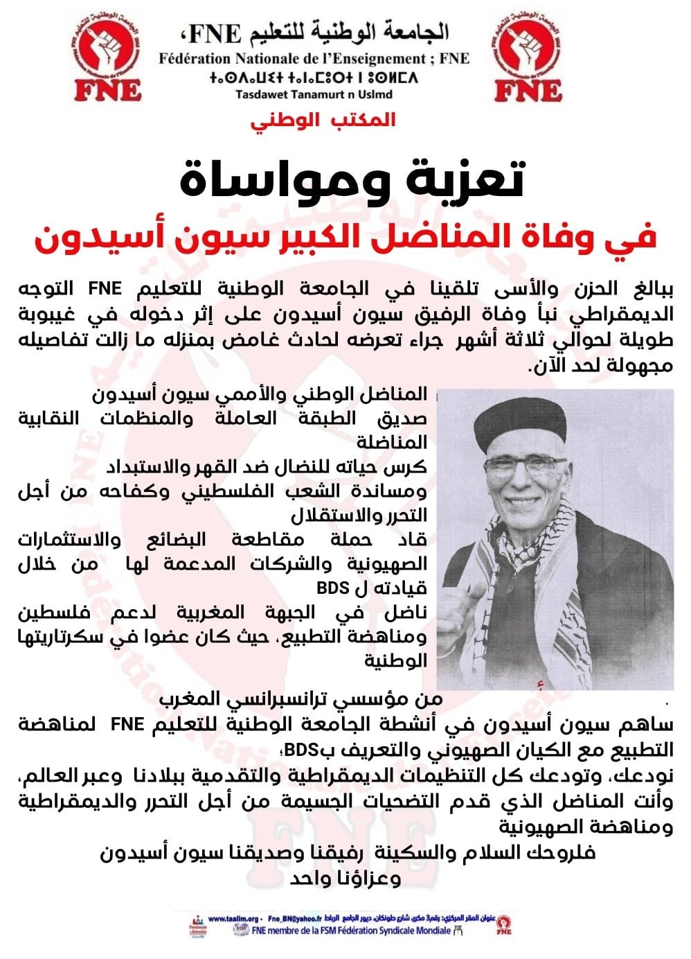 في وداع صوت الحرية والالتزام الإنساني: سيون أسيدون بيانات و بلاغاتمستجدات وأخبار 8 نوفمبر 2025 شارك رحيل سيون أسيدون خسارة كبيرة لصوت من أصدق الأصوات التي ناضلت من أجل الحرية والكرامة والعدالة. كان رمزًا للنزاهة الفكرية والالتزام الأخلاقي، لا يساوم على القيم ولا يصمت أمام الظلم. ترك وراءه مسارًا حافلًا بالمواقف الشجاعة والعمل الميداني المخلص، سيبقى مثالًا يُحتذى لكل من يؤمن بأن النضال فعل إنساني مستمر يتجاوز الحدود والانتماءات.