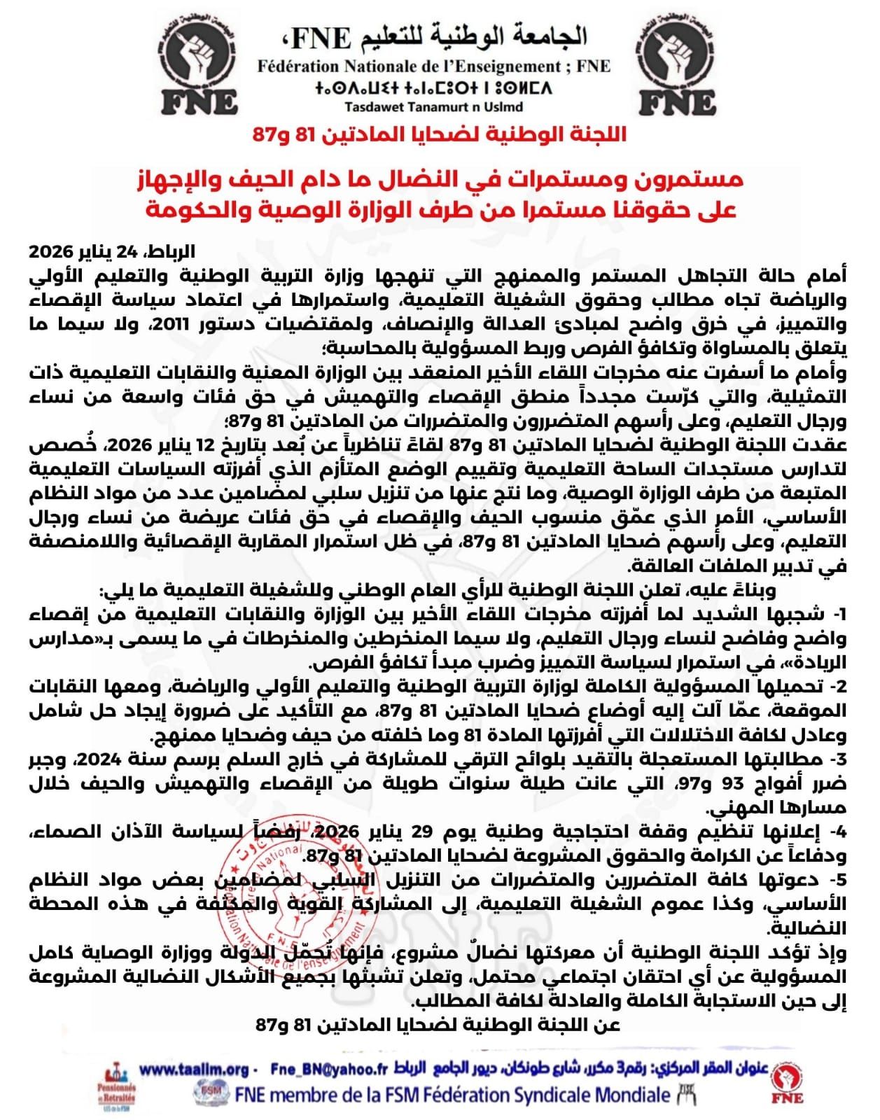 أعلنت اللجنة الوطنية لضحايا المادتين 81 و87 التابعة للجامعة الوطنية للتعليم FNE (التوجه الديمقراطي) عن تنظيم وقفة احتجاجية وطنية يوم الأربعاء 29 يناير 2026 أمام مقر وزارة التربية الوطنية والتعليم الأولي والرياضة بالرباط.