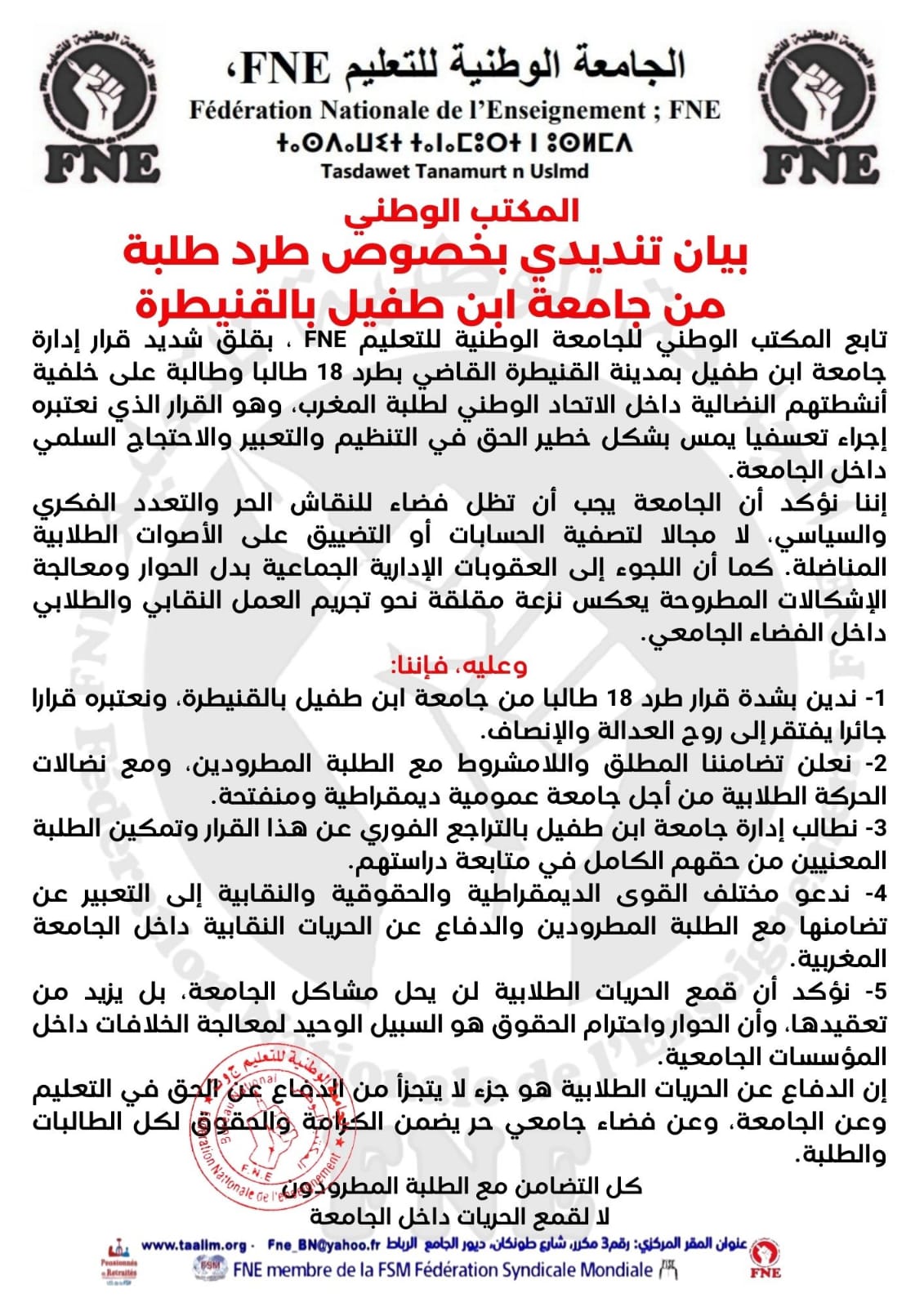 تابع المكتب الوطني للجامعة الوطنية للتعليم FNE، بقلق شديد قرار إدارة جامعة ابن طفيل بمدينة القنيطرة بطرد 18 طالبا وطالبة على خلفية أنشطتهم النضالية داخل الاتحاد الوطني لطلبة المغرب، وهو القرار الذي نعتبره إجراء تعسفيا يمس بشكل خطير الحق في التنظيم والتعبير والاحتجاج السلمي داخل الجامعة.