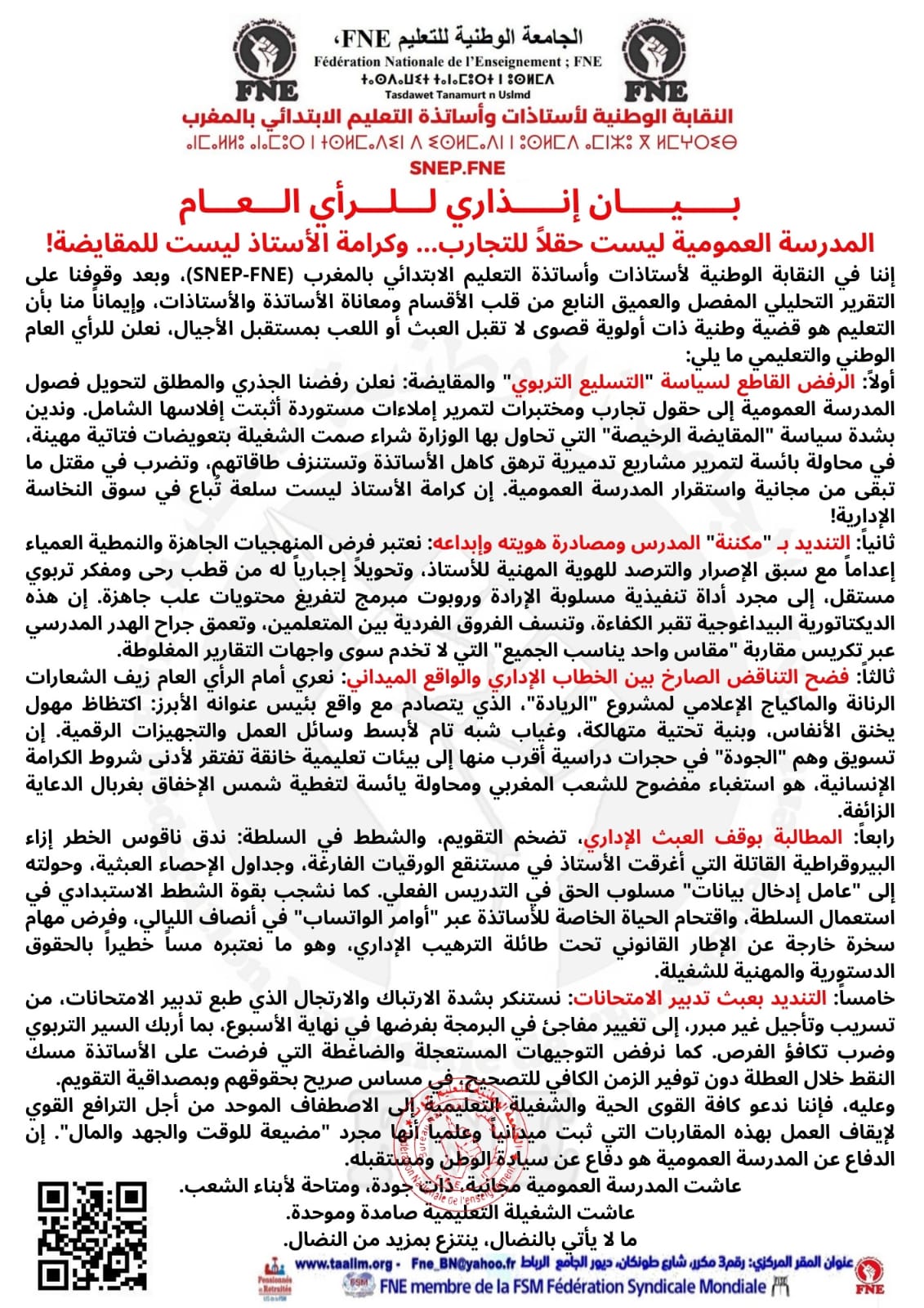 إننا في النقابة الوطنية لأستاذات وأساتذة التعليم الابتدائي بالمغرب (SNEP-FNE)، وبعد وقوفنا على التقرير التحليلي المفصل والعميق النابع من قلب الأقسام ومعاناة الأساتذة والأستاذات، وإيماناً منا بأن التعليم هو قضية وطنية ذات أولوية قصوى لا تقبل العبث أو اللعب بمستقبل الأجيال، نعلن للرأي العام الوطني والتعليمي ما يلي: