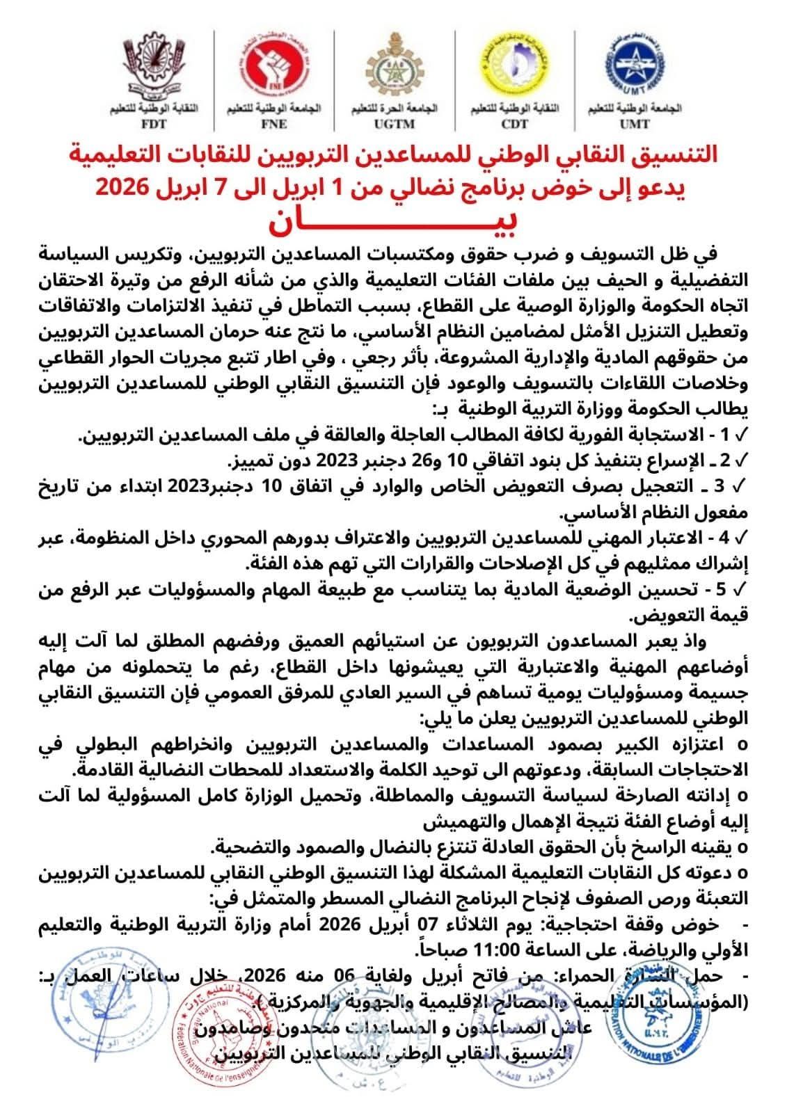 التنسيق النقابي الوطني للمساعدين التربويين للنقابات التعليمية يدعو إلى خوض برنامج نضالي من 1 ابريل الى 7 أبريل 2026