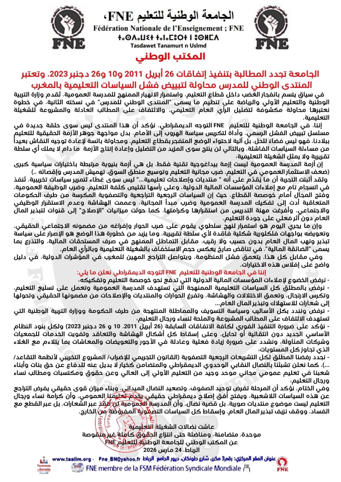 إننا في الجامعة الوطنية للتعليم FNE التوجه الديمقراطي نعلن ما يلي: