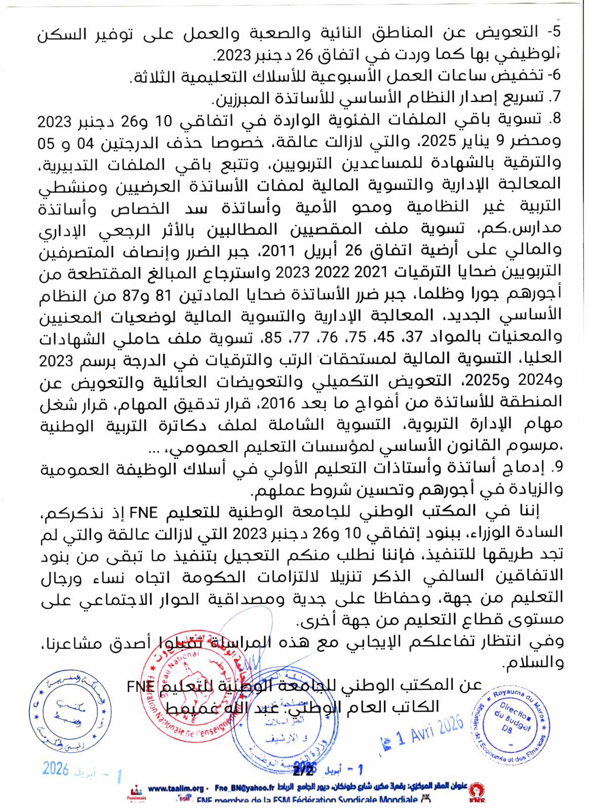 عن المكتب الوطني للجامعة الوطنية للتعليم FNE الكاتب العام الوطني: عبد الله غميمط
