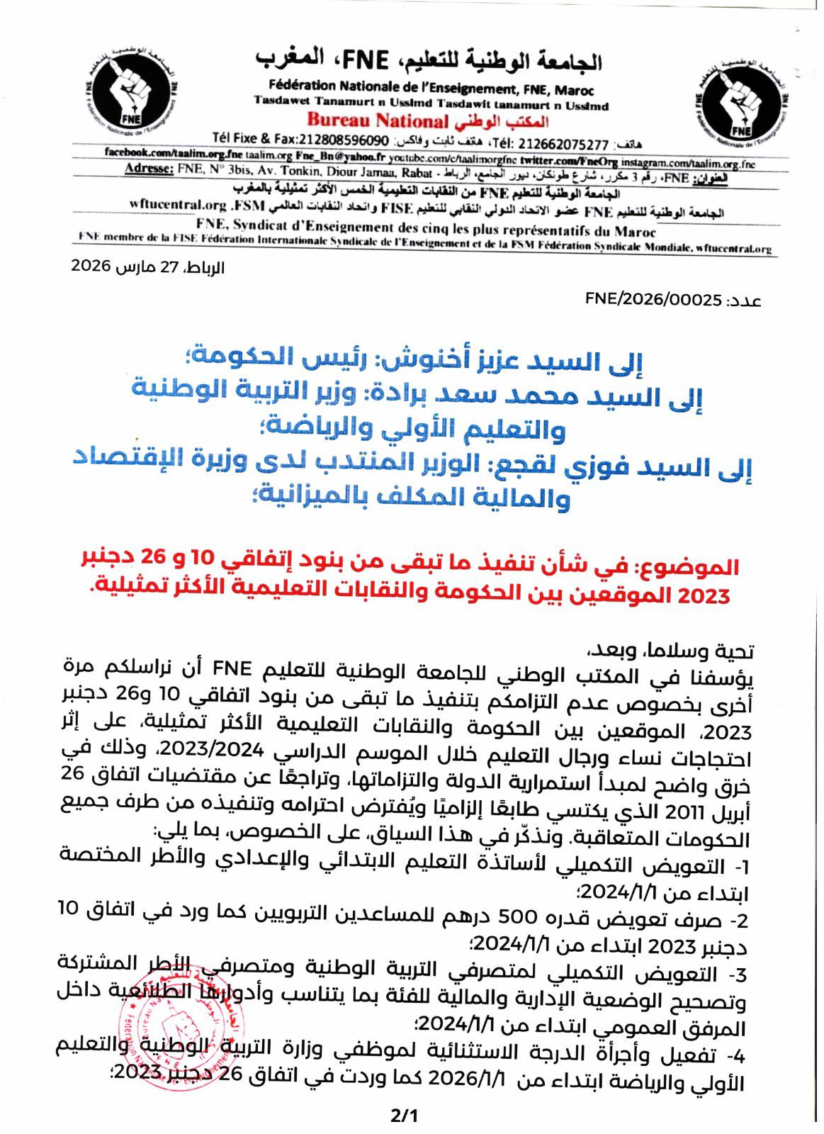 يؤسفنا في المكتب الوطني للجامعة الوطنية للتعليم FNE أن نراسلكم مرة أخرى بخصوص عدم التزامكم بتنفيذ ما تبقى من بنود اتفاقي 10 و26 دجنبر 2023، الموقعين بين الحكومة والنقابات التعليمية الأكثر تمثيلية، على إثر احتجاجات نساء ورجال التعليم خلال الموسم الدراسي 2023/2024، وذلك في خرق واضح لمبدأ استمرارية الدولة والتزاماتها، وتراجعًا عن مقتضيات اتفاق 26 أبريل 2011 الذي يكتسي طابعًا إلزاميًا ويُفترض احترامه وتنفيذه من طرف جميع الحكومات المتعاقبة. ونذكّر في هذا السياق، على الخصوص، بما يلي: