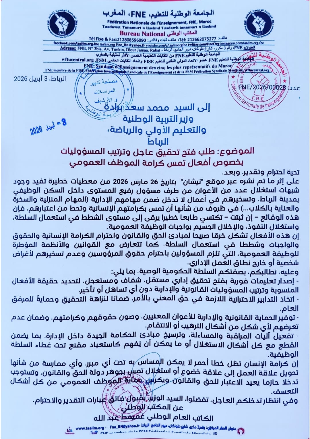 إصدار تعليمات فورية بفتح تحقيق إداري مستقل، شفاف ومستعجل، لتحديد حقيقة الأفعال المنسوبة وترتيب المسؤوليات القانونية والإدارية دون أي تساهل أو تأخير.