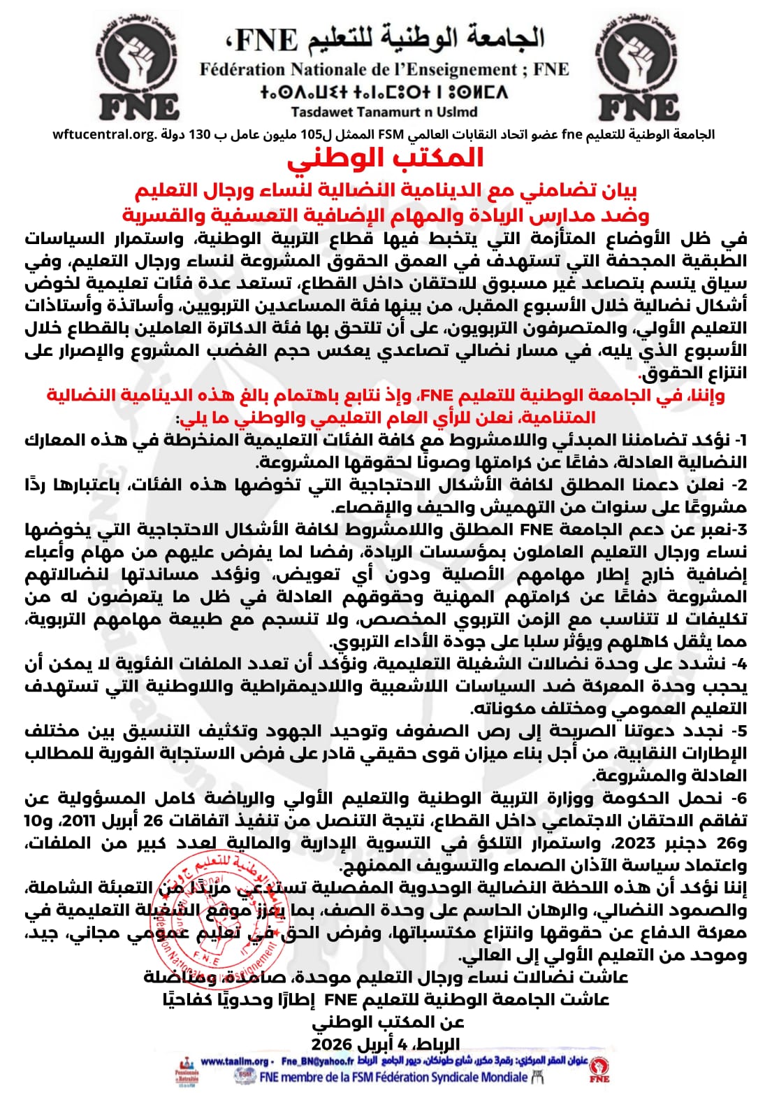 المكتب الوطني بيان تضامني مع الدينامية النضالية لنساء ورجال التعليم وضد مدارس الريادة والمهام الإضافية التعسفية والقسرية 4 أبريل 2026